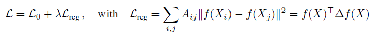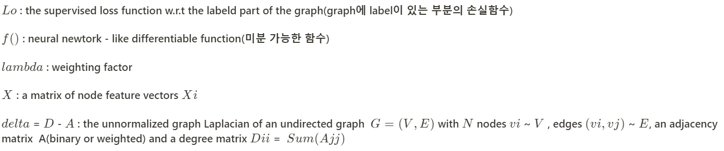 citation network와 같은 graph에서의 classifying nodes(such as document)는 소수 집단의 노드에만 label이 가능하다는 문제점이 존재한다. 이는 graph 기반 semi-supervised learning(준지도학습)으로부터 형성된 문제이며, loss function에 Laplacian Regularization을 사용함으로써 발생한 것이다.
