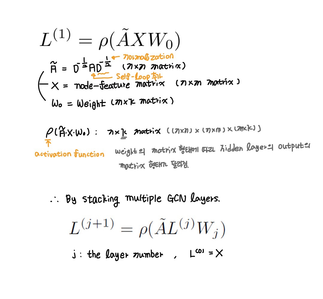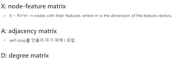 Adjacency Matrix는 자기 자신의 특성을 반영하지 않는다. 따라서, self-loop를 해주기 위해서 대각행렬이 모두 1인 행렬을 더해주어야 한다. 그러면 자기 자신의 특성을 반영할 수 있다. degree matrix는 노드에 연결된 node의 개수 혹은 edge의 개수로 이해하면 된다. degree matrix의 역행렬을 통해 normalization을 해주며 이는 back-propgation 안정화 효과가 있다.