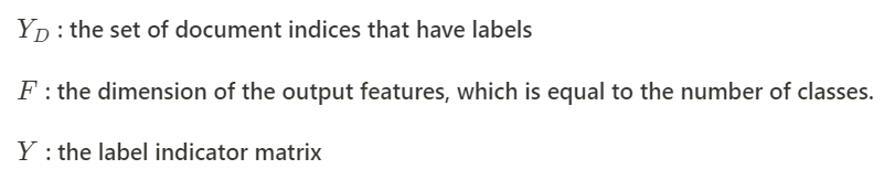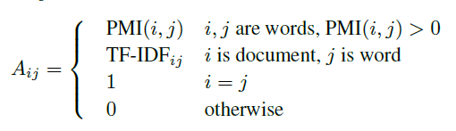 - [the weight of the edge between document node and a word node] : the term-frequency-inverse document frequency(TF-IDF) of the word in the document