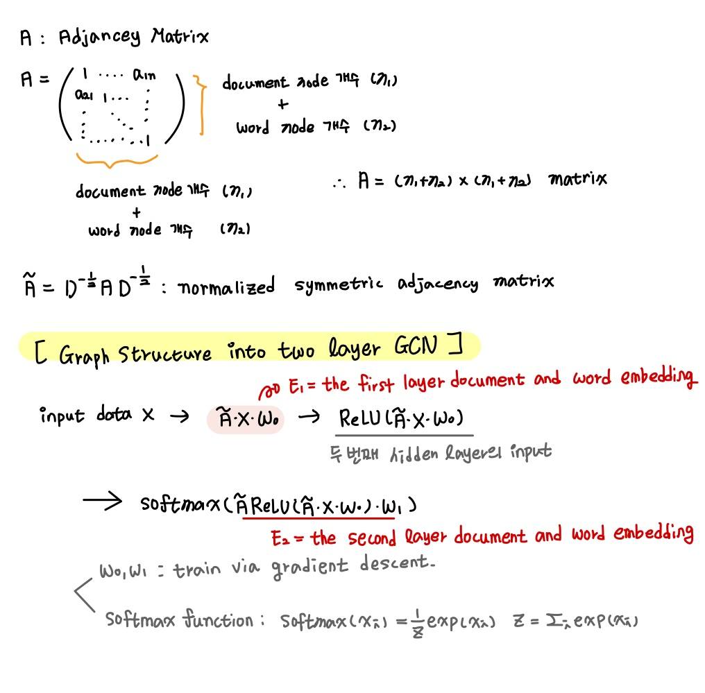 논문에서는, node-feature matrix X=I(indentitymatrix)로 표현했다. 이는 Text GCN의 input인 모든 word/document 노드의 feature는 one-hot vector로 표현되어 진다는 것을 나타낸다.