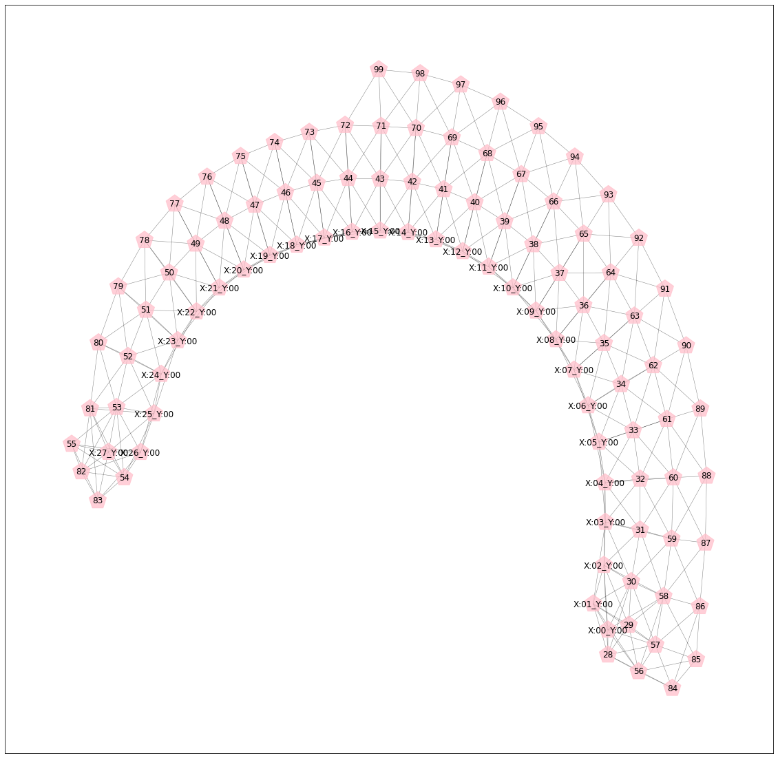 node와 edge를 통해 graph를 형성한 후, node 100개만 뽑아서 확인해 본 결과 다음과 같다. 노드 간의 연결 여부는 자기 자신 포함해서 가장 가까운 거리에 있는 노드 8개와 연결되도록 만들어줬다.