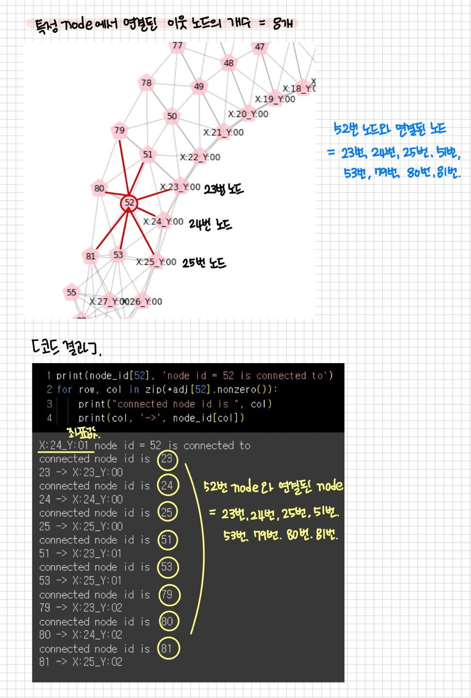 52번 노드만 따로 빼서 확인해 보면, (23번, 24번, 25번, 51번, 53번, 79번, 80번, 81번) node와 연결된 것을 확인할 수 있다.