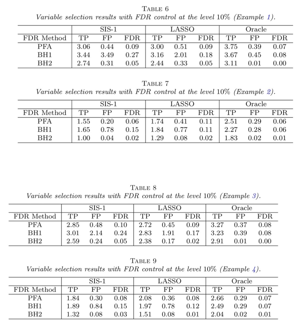 이제는 oracle p-value를 통해 FDR control이 잘 작동하는지 확인해 보고자 한다. 우리는 FDR을 유의수준 0.1로 통제하는 것을 목표로 한다. 네가지 회귀모형 모두 100번의 시뮬레이션을 했으며 true positive(TP), false positive(FP), the average FDR에 대한 결과는 다음과 같다.
