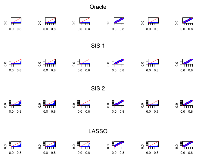 oracle 결과는 실제 oracle p-value 값이며, SIS-1, SIS-2, LASSO는 oracle p-value 값을 근사한 것이다. 4가지 결과 모두 비슷한 것을 확인할 수 있으므로 SIS-1, SIS-2, LASSO가 실제 oracle p-value를 잘 근사하는 것을 알 수 있다.