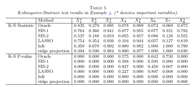 k-s 통계량을 확인해보면, important variable인 $\left\{x_1,x_2,x_3,x_5\right\}$의 p-value 값은 significant한 반면, noise variable인 $\left\{x_4,x_6\right\}$는 non-significant한 것을 알 수 있다. 즉, important variable은 p-value가 균일분포를 따라야 한다는 귀무가설을 기각하고, noise variable은 p-value가 균일분포를 따라야한다는 귀무가설을 기각하지 못 한다. 결론적으로, noise variable의 oracle p-value는 귀무가설 하에서 균일분포를 따라야한다는 가정을 만족한다.