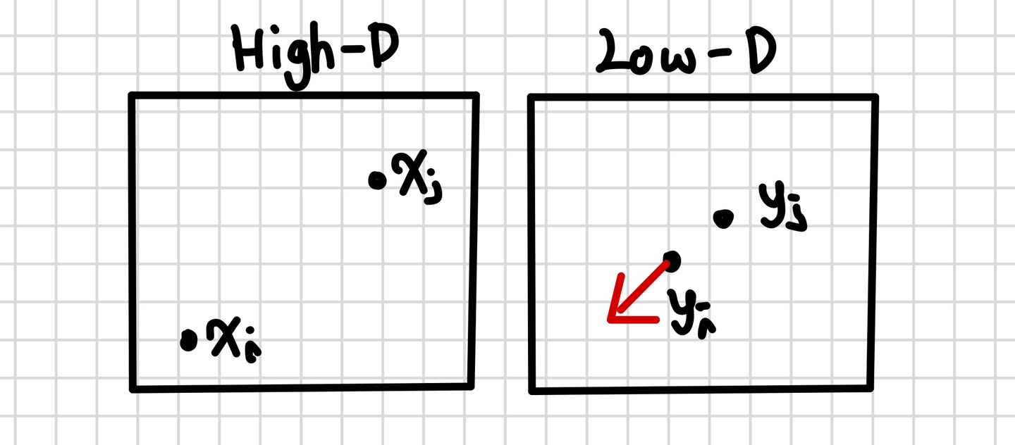 - Embedding = 기존의 데이터 $x_i$를 $y_i$로 embedding 할 때 저차원 공간상에서의 확률분포 $Q_i$는 고차원 고간(기존의 공간) 상에서의 확률분포 $P_i$와 유사하도록 만들어줘야 한다.