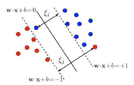 - $\text { Constraint : } g = y_i(w^t \cdot x_i-b) \geq 1 - \xi_i , \, \xi_i \geq 0 \, \forall{i}$