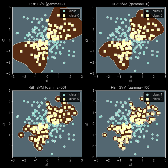 - $\gamma$값이 커질수록, 즉 $\sigma$ 값이 작아질수록, hyper-plane에 가까이 있는 데이터 샘플에 대해서만 영향을 크게 받기 때문에 점점 더 구불구불해지는 것을 알 수 있다.