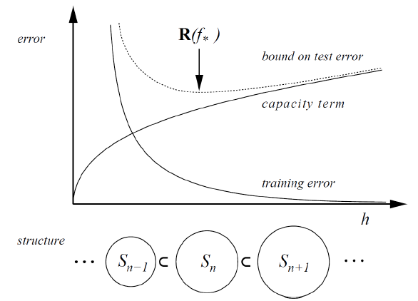 - Structural Loss = training error + capacity term = $R_{emp}[f]+\sqrt{\dfrac{h(ln\dfrac{2n}{h}+1)-ln\dfrac{\delta}{4}}{n}}, \, \delta \geq 0$