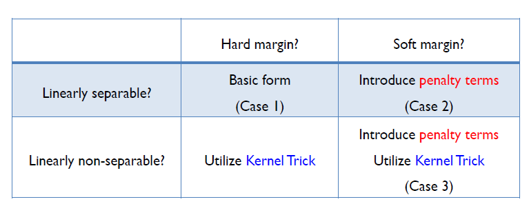 - $C$: margin을 최대화하는 term과 penalty term 간의 trade-off 관계를 조절하는 parameter