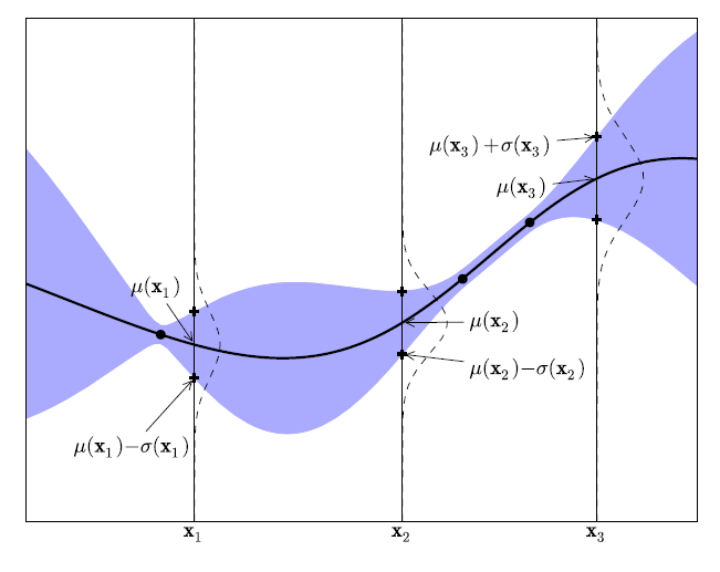 'Figure 2' 그림을 통해 설명하면 다음과 같다. 가로축은 최적화하고 싶은 hyper-parameter 입력값($\{x_{1:t}\}$)이며 세로축은 함숫값 $f(x)$이다. 검은색 점선은 실제 목적 함수, 검은색 실선은 현재까지 조사된 점들 $((x_1,f(x_1)),...,(x_t,f(x_t)))$에 의거하여 추정된 각 $x$ 위치별 평균 $\mu(x)$, 즉 추정된 평균함수이다. 보라색 음영은 각 $x$ 위치별 표준편차 $\sigma(x)$이다. $\mu(x)$의 경우, 현재까지 조사된 점들 $((x_1, f(x_1)), (x_2, f(x_2)), ... , (x_t, f(x_t)))$를 반드시 지나도록 그 형태가 결정되며, 조사된 점에서 가까운 위치에 해당할수록 $\sigma(x)$가 작고, 멀어질수록 $\sigma(x)$ 값이 커진다. 즉, 조사된 점(observation $(x)$)으로부터 거리가 먼 $x$일수록, 이 지점에 대해 추정한 평균값의 불확실성이 크다는 것을 알 수 있다. 또한, 초기 입력값은 2개를 사용했으며 조사된 점의 개수가 점차적으로 증가할수록($t=2 -> t=3 -> 4=5 -> ....$), $\sigma(x)$가 큰 영역의 크기가 점차적으로 감소하여 실제 목적 함수에 대한 추정결과가 점차적으로 압축되는 양상을 보인다. 즉, 조사된 점의 개수가 증가할수록 목적함수의 추정결과에 대한 '불확실성'이 감소하며 최적해 $x^*$를 찾을 가능성이 계속해서 증가한다.