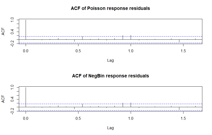 적합 결과를 확인해 보면, 추정된 회귀 계수 값은 같지만 분산이 $Y_t$의 조건부 분포가 음이항 분포인 경우 더 큰 값을 가지는 것을 확인할 수 있습니다. 또한 추정된 과대산포(sigmasq) 값은 $0.112$로 상대적으로 작은 값을 가집니다. Figure 2를 통해 두 모델의 $Y_t$의 상관계수($Corr(Y_t, Y_{t+h})$)가 같음을 확인할 수 있으며 계절성이나 상관성이 보이지 않는 것을 확인할 수 있습니다.