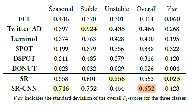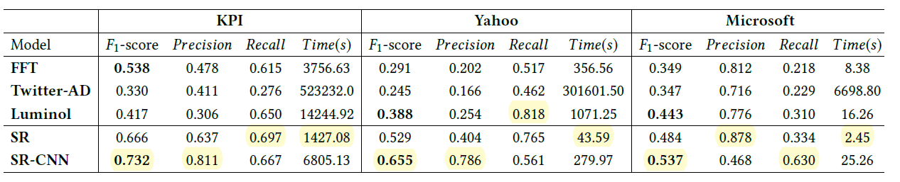 [Table 1]과 [Table 2]를 통해 SR-CNN의 accruacy(F1-score, Precision, Recall)와 efficiency(Time(s))를 확인해 본 결과 대부분의 결과에 있어 SR-CNN의 accuracy가 가장 좋은 것을 확인할 수 있습니다. 반면, efficiency의 경우 SR이 SR-CNN보다 더 작은 것을 확인할 수 있습니다. 이에 대해서 개인적으로 생각해본 결과 SR의 경우는 임의의 하나의 threshold를 가지고 anomaly point 여부를 판단하지만 SR-CNN의 경우는 discriminate model(CNN)을 훈련함으로써 anomaly point를 판단하기 때문에 더 많은 시간이 상대적으로 소요된다고 생각합니다.