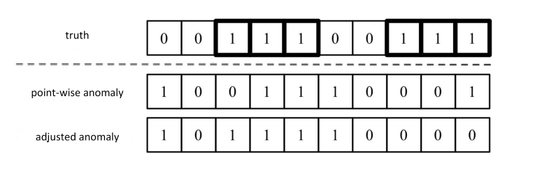 첫번째 행은 true label로 총 10개의 점과 2개의 anomaly segments가 존재하며 두번째 행은 prediction results(예측 결과값)입니다. Delay threshold $k=1$로 설정한 경우, 첫번째 anomaly segments는 delay가 1이므로 correct, 두번째 anomaly segments는 delay가 2이므로 incorrect합니다. 세번째 행은 예측 결과를 조정한 값으로 이를 기반으로 precision, recall, F1-score를 계산합니다.