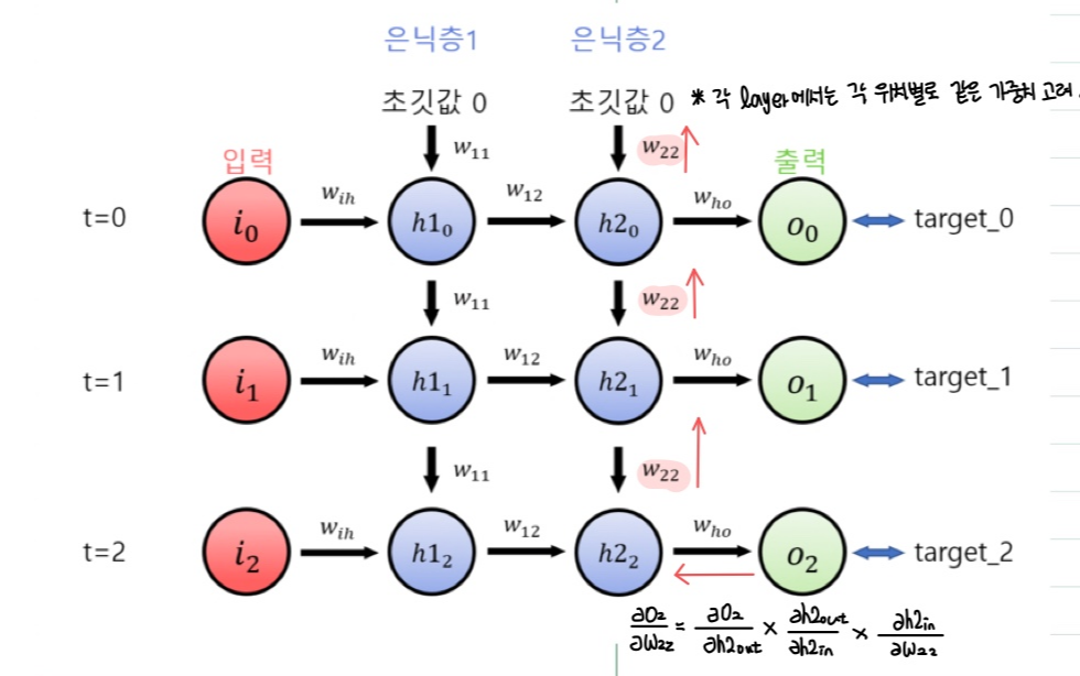 $\dfrac{\partial h2_{\text{in}}}{\partial W_{22}}=h2_{(t=1)}$으로 이전 시점들의 조합으로 이루어져있고 내부적으로 $W_{22}$를 포함하고 있기 때문에 결과적으로 제대로 미분하기 위해서는 $t=0$ 시점까지 미분해야 합니다. RNN은 각 층별로 같은 가중치를 공유하기 때문에 발생하는 현상입니다.