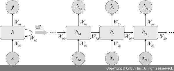 - $W_{hh}$: $t$ 시점의 은닉층 노드에서 $t+1$ 시점의 은닉층 노드로 전달되는 가중치