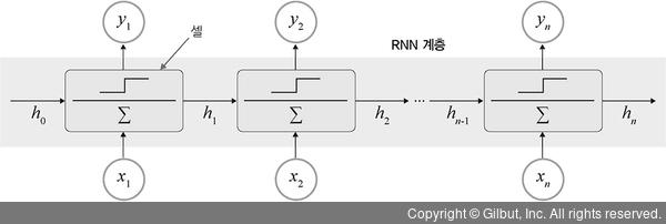 ※ 첫번째 입력 $x_1$ → 첫번째 기억 $h_1$ 생성 → 두번째 입력 $x_2$ → 기존 기억 $h_1$과 새로운 입력 $x_2$를 참고하여 새 기억 $h_2$를 만듦 → · · · → 이 과정을 입력 길이만큼 반복