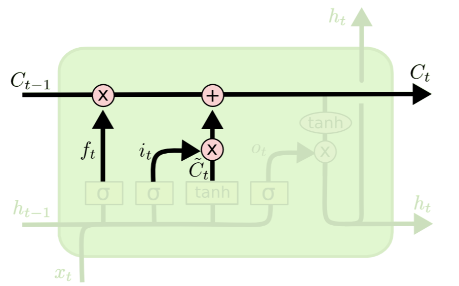 $$C_t = f_t \cdot C_{t-1} + i_t \cdot \tilde{C}_t$$