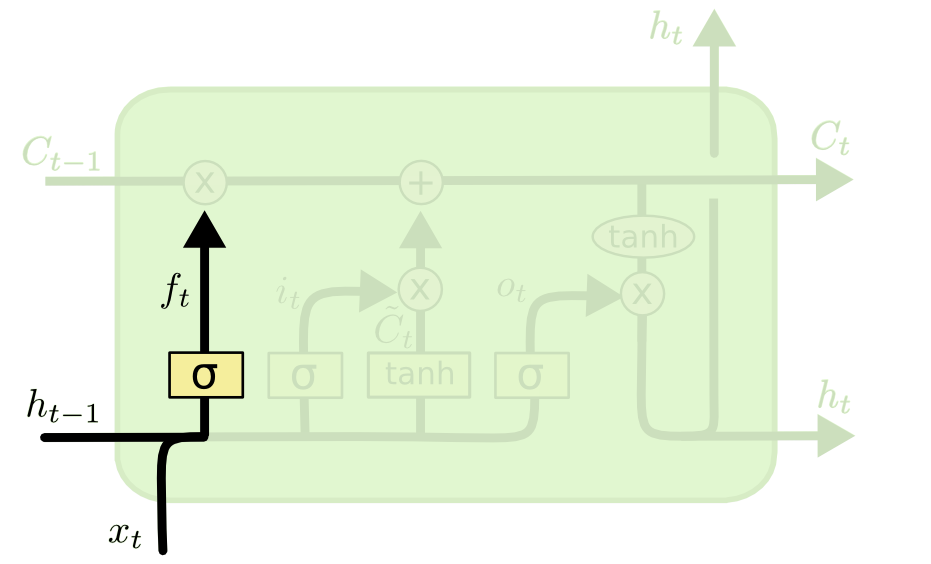 $$f_t = \sigma(W_fh_{t-1} + W_f x_t + b_f)$$