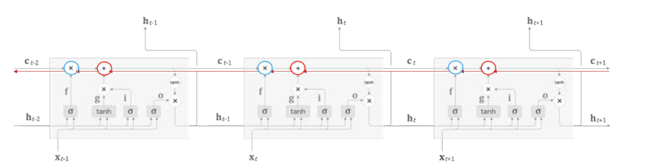 빨간색 선(red line)은 셀 $C_t$을 통해서 역전파 되어가는 과정을 나타냅니다. 빨간색 선(red line)을 살펴보면 오직 2개의 연산(($+$), (×))만이 역전파 수행에 관여하는 것을 볼 수 있습니다.