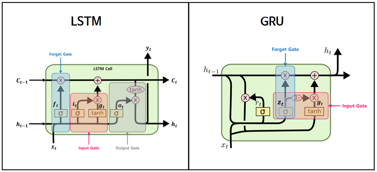 Gated Recurrent Unit(GRU)의 구조에 대해 자세하게 살펴보기 전 Long Short Term Memory(LSTM)과의 비교를 통해 GRU에 대해 간략하게 살펴보고자 합니다.