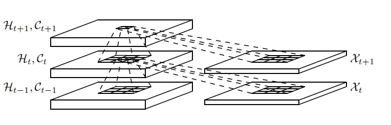 FC-LSTM의 경우 시간적 상관관계(temporal correlation)을 다루는데는 강력하고 유용한 모델이지만 공간 정보(spatial information)에 대해서는 다루지 않습니다. FC-LSTM의 경우, input-to-state와 state-to-state transition 시 full connection을 사용합니다. 즉, input gate, forget gate, output gate 및 cell state 입력값으로 각 input data와 hidden state의 선형 변환($W_{xi} x_t, W_{hi} h_t, W_{xf} x_t, W_{hf} h_t, W_{xo} x_t, W_{ho} h_o, W_{xc}x_t , W_{hc} h_{t-1} $)된 값이 들어가기 때문에 공간 정보에 대해서는 인코딩(encoding)을 하지 않습니다.