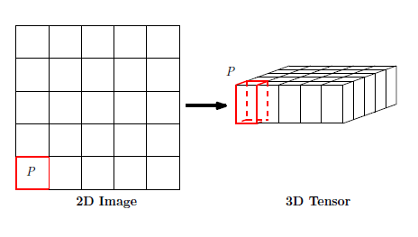 시점별 이미지의 픽셀(pixel)은 $P$개의 measurement로 이루어져 있습니다. 다르게 생각하면 input time sequence는 넓이(width)가 $m$, 높이(height)가 $n$, 채널(channel) 수가 $P$인 3D tensor로 생각할 수 있습니다( $\chi_t \in \mathbb{R}^{P \times m \times n}$).