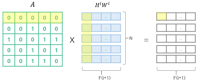 - 새로 만들어진 matrix에 대해 인접성 행렬을 곱하면, 결과로 나오는 matrix의 (i, j)의 값은 node i와 연결된 모든 node의 j번째 행렬 값의 합으로 구해진다. (즉, 각각의 node와 연결되어 있는 노드의 정보를 모아 feature update)