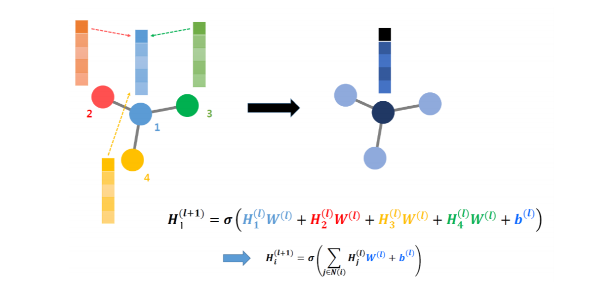 node의 (l+1)번째 node feature matrix를 나타낸 것인데, 이는 node 1과 인접한 모든 node들의 node feature matrix에 각 weight를 곱하고 bias를 더하여 activation function을 씌어주어 update 한 것이다.