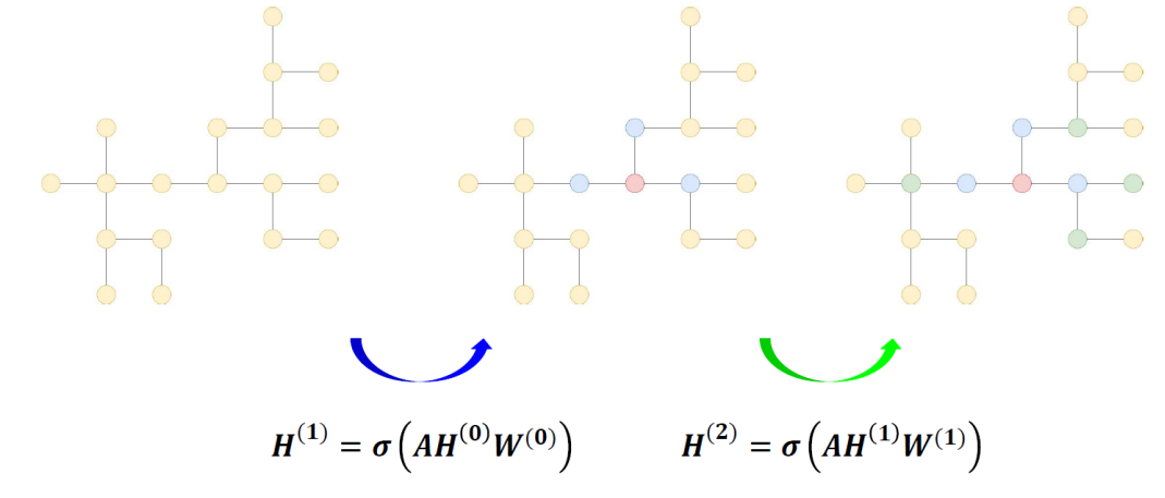 다른 그림을 통해서도 설명을 해보고자 한다.(W: weight, l: l번째 Layer, H: Hidden State(=각 layer를 거치고 난 뒤의 node feature matrix))
