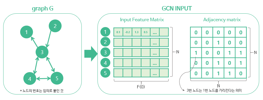 G(Graph) = (V, E)가 주어질 때 GCN은 다음을 input으로 받는다.