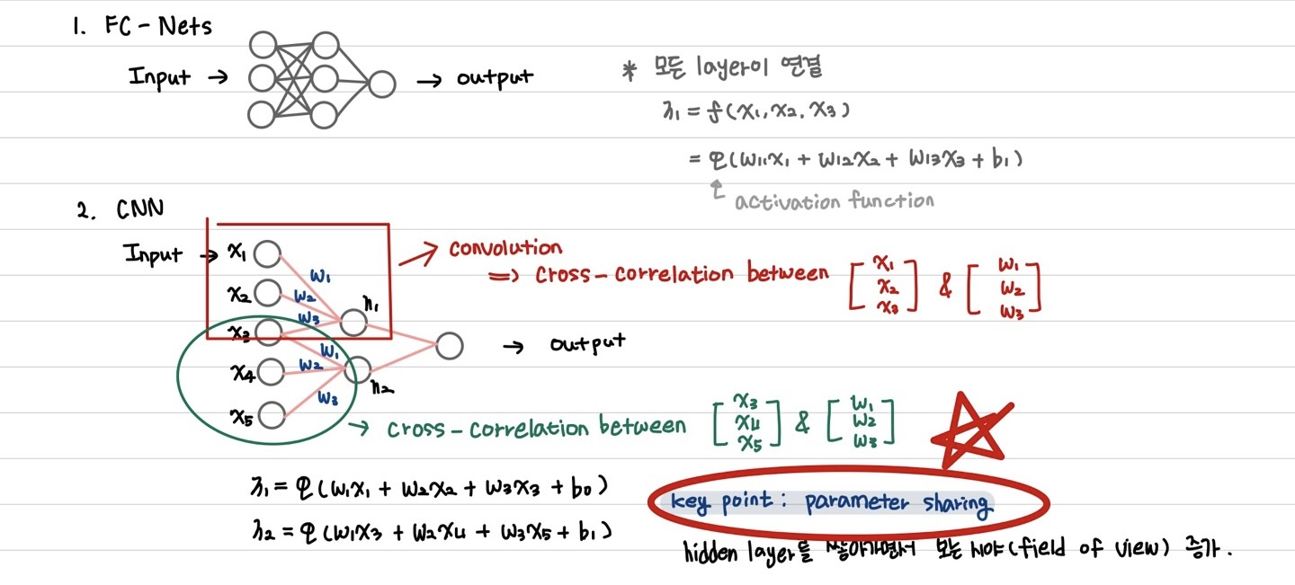 CNN은 이미지를 작은 구역으로 나누어 지역적인 정보를 계속 취합하는 식으로 작동한다. CNN은 크게 Feature Learning 단계와 Classification 단계로 나눌 수 있다. Feature Learning 단계에서는 convolution 연산과 pooling 연산을 반복적으로 수행한다. convolution은 각각의 구역으로부터 정보를 추출하고 pooling 연산은 추출된 정보 중 태스크 수행(이미지 분류 등)에 중요한 정보만을 남기는 작업을 한다. Classification 단계에서는 주로 Fully Connected(MLP)을 사용하는데 이미지 task에서 MLP를 이용한 방법론은 모든 node와 layer가 이어져 있기 때문에 parameter의 수가 기하급수적으로 증가한다. 또한, image에서 pixel이 조금이라도 틀어지면 기존의 parameter가 변질되기 때문에 성능이 안 좋아진다는 단점이 있다. 결론적으로 image에서 important feature를 추출하는 게 중요하다.