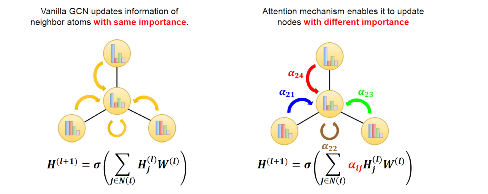 - Attention을 적용한 GCN은 동일한 가중치를 주지 말고, 특정 비율로 합하여 업데이트 하자는 것이다.
