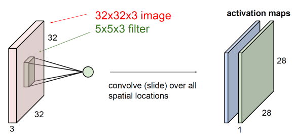 Convolution Filter(kernel)를 이용하여 image를 순회하는 dot product를 계산하고, 기존의 데이터로부터 filter를 이용하여 새로운 tensor(=activation map)을 만드는 것.