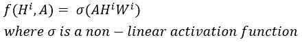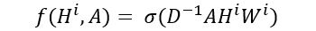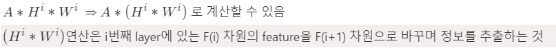 - W는 i번째 layer의 weight matrix로, F(i) * F(i+1)의 dimension을 가진다.(feature의 차원을 변화)