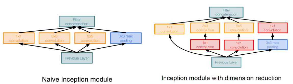 - depth가 깊어지는 단점을 보완하기 위해 1 by 1 filter를 적용시켜서(->dimension reduction) computation efficiency를 향상시킨다.
