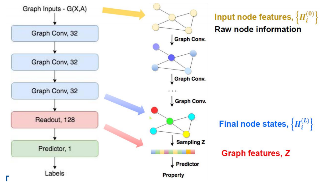 - Node Feature Matrix인 X와 Adajency Matrix인 A를 갖는 graph를 input 하였을 때, 원하는 만큼의 convolution 연산을 거치고 Readout을 적용한 후 fully connected layer를 거친 후 우리가 원하는 결과를 얻는다.