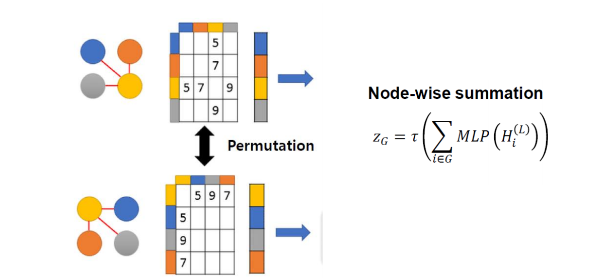 - l번째 node feature matrix에 대해 MLP(=fully connected)를 씌어주어 sum을 한 후 activation을 씌우면 같은 위상에 대해서 다른 node 위치를 갖는 graph에 대해 동일한 결과를 낼 수 있다.