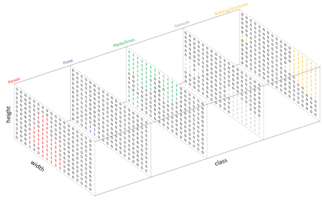그 다음, 각 픽셀별로 각 카테고리에 속하면 $1$, 아니면 $0$( → 원-핫 인코딩(one-hot encoding))으로 포함 여부를 계산하면 총 $5$개의 출력 채널이 만들어집니다.