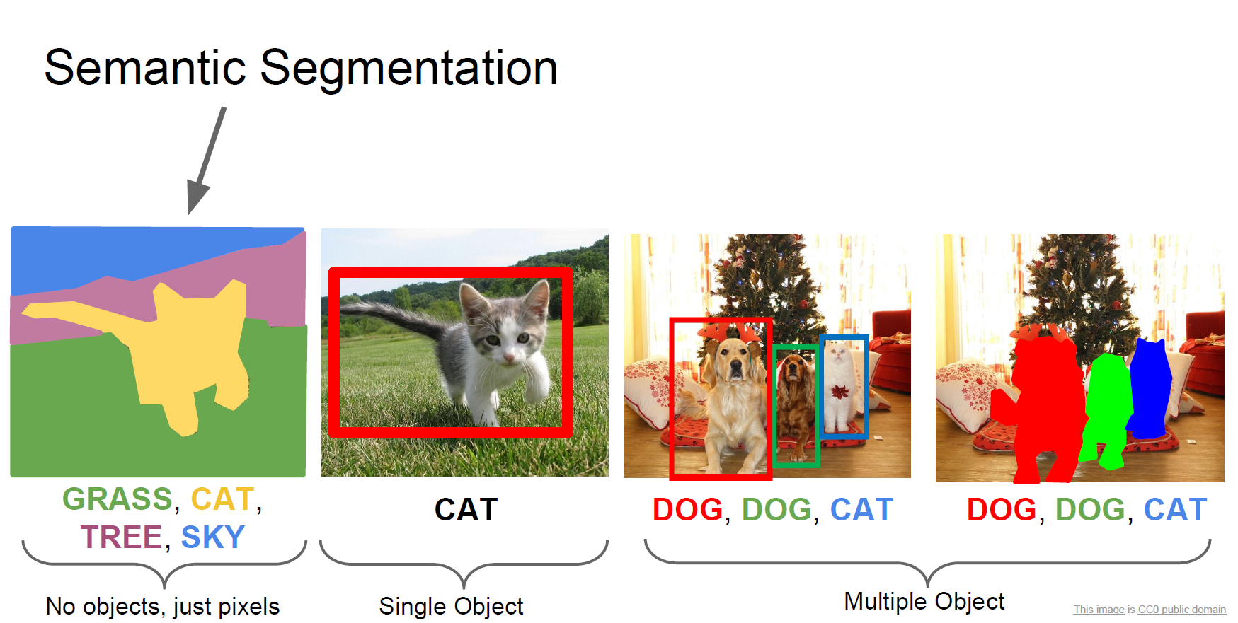 ▶ 개요 Computer vision에는 크게 4가지의 task가 존재합니다. 1. Semantic Segmentation 이미지 안의 모든 픽셀(pixel)들에 대해서 classification(or categorize)을 합니다. (예시) [Figure 1]에서의 'senmantic segmentation'은