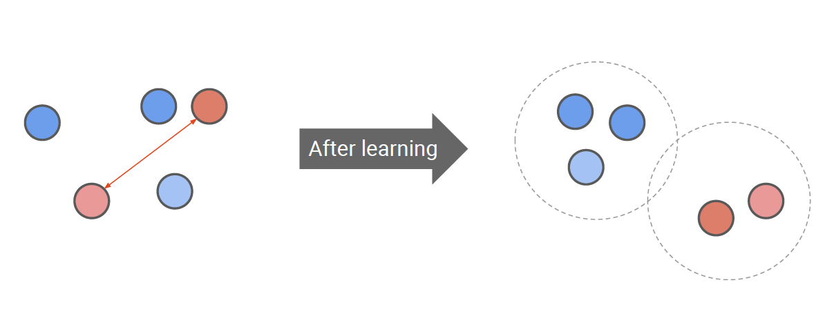 Contrastive Learning은 [Figure 8]과 같이 임베딩 공간(embedding space) 상에서 비슷한 속성을 가진 객체끼리는 서로 가깝게, 다른 속성을 가진 객체끼리는 서로 멀리 위치하도록 학습합니다. Contrastive Learning에서는 주요한 4가지 개념이 존재합니다.