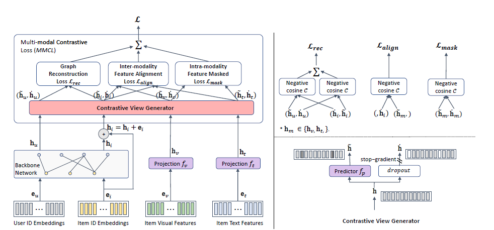 $$L_{rec} = C(\tilde{h}_u, sg(\dot{h}_i)) + C(sg(\dot{h}_u), \tilde{h}_i)$$